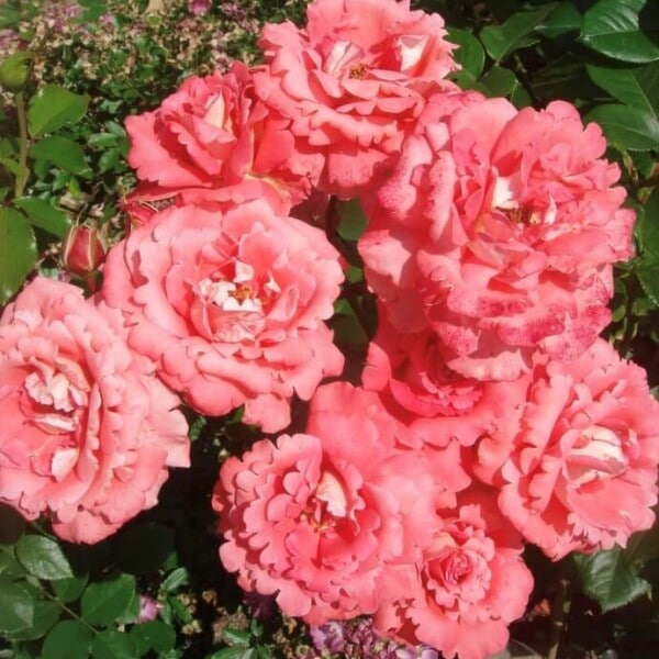 Куст крепкий 80 см ветвистый. Листья темно-зеленые глянцевые мелкие. Молодые листья свекольного цвета. Цветы имеют теплый розовый цвет с желтым основанием и более яркими краями, не крупные, классической формы (диаметр 4-5 см.), махровые, с резными лепестками. Цветов и бутонов множество и все смотрят вверх, не поникая, дождя не боятся и держатся долго. Очень декоративный кустик. Быстрое повторное цветение. Приятный аромат. Зимует хорошо и совсем не болеет.