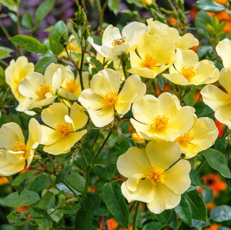 Красота этого сорта раскрывается и в лаконичности одиночных цветков, и в выразительном эффекте, который создаёт их обильное цветение. Крупные, открытые соцветия насыщенно-жёлтого оттенка украшены яркими золотистыми тычинками. Со временем цветки мягко светлеют, источая лёгкий мускусный аромат с освежающими нотами апельсиновой цедры. Роза отличается обильным и повторным цветением на протяжении всего лета. Куст крупный, здоровый, хорошо разветвлённый, с гармоничной округлой формой.
