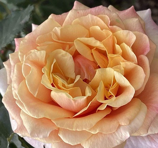 Квітка: ніжно персикова до оранжево-абрикосового з темно-рожевим напиленням по краю зовнішніх пелюсток, розеткоподібна з краєм пелюстки, що закручується, густомахрова, 60 - 80 пелюсток в одній квітці, діаметр квітки 8 - 12 см, має насичений аромат.